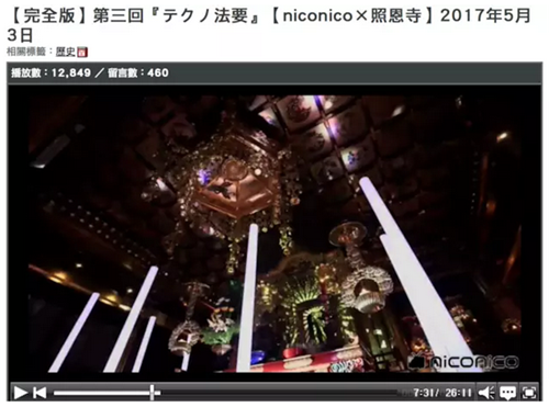 這是日本福井市照恩寺的一場(chǎng)超度儀式,跟以往莊嚴(yán)肅穆的宗教儀式相比,這場(chǎng)電音法會(huì)顯得極“不正經(jīng)”。除了用電子音樂(lè)誦經(jīng)、3D全息技術(shù)投影、五光十色的照明之外,這場(chǎng)法會(huì)還在日本彈幕網(wǎng)站鼻祖 niconico 上進(jìn)行了直播,引來(lái) 1.9 萬(wàn)人觀看。