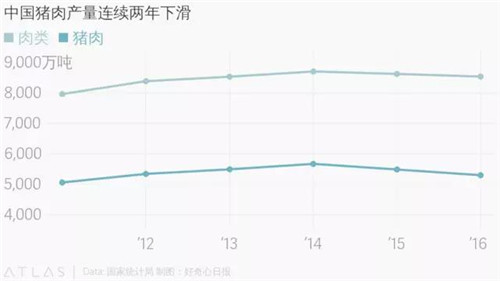 一直以來,中國都是肉類消費大國。按照美國農業(yè)部的估計,中國消費者今年所食用的豬肉、牛肉和雞肉加起來會是美國消費者的兩倍。不過,國家統(tǒng)計局的數(shù)據(jù)顯示,2015 年開始,中國肉類消費有所下降。去年,國內肉類產(chǎn)量同比下降了 1%,而占比最高的豬肉產(chǎn)量同比減少了 3.4%。