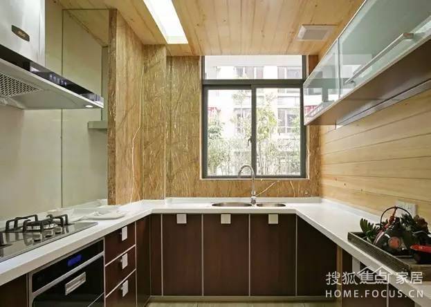 U型櫥柜設計儲物功能大,左邊吊柜統(tǒng)一采用開放柜與封閉柜不僅美觀,而且方便擺放和儲藏物體,棕色背景與面板形成呼應,使空間更為溫馨、自然。