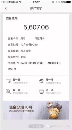 10月19日凌晨,市民王女士被接踵而至的三條信息叫醒,看過之后她睡意全無,這是三條信用卡的消費(fèi)記錄,記錄顯示自己的招商銀行信用卡共消費(fèi)8035.97美元,按照匯率差不多是54000元左右。