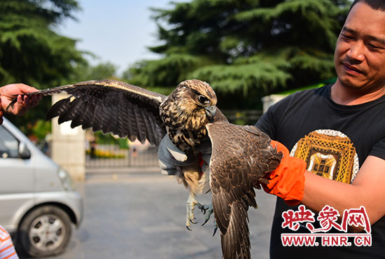 中牟縣林業(yè)局接到警方的電話后,工作人員冉占杰、朱鑫驅(qū)車(chē)趕到現(xiàn)場(chǎng),卻也沒(méi)有認(rèn)出該鳥(niǎo)的鳥(niǎo)名。工作人員將大鳥(niǎo)帶回單位后,進(jìn)行喂水喂食。隨后,他們將圖片發(fā)至鄭州市林業(yè)局野生動(dòng)物救護(hù)站。董朝偉站長(zhǎng)認(rèn)出:它非同小可,竟然是國(guó)家二級(jí)重點(diǎn)保護(hù)動(dòng)物,蒙古國(guó)國(guó)鳥(niǎo),珍稀而罕見(jiàn)的獵隼。