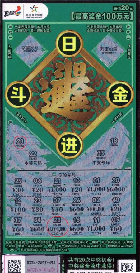 “日進(jìn)斗金”面值20元,共有三個(gè)游戲。游戲一和游戲二,刮開(kāi)覆蓋膜,如果出現(xiàn)金額標(biāo)志,即中得該金額;游戲三:刮開(kāi)覆蓋膜,如果你的號(hào)碼中任意一個(gè)號(hào)碼與中獎(jiǎng)號(hào)碼之一相同,即中得該號(hào)碼下方所示的金額;如果出現(xiàn)銅錢(qián)標(biāo)志,即中得該標(biāo)志下方所示金額的3倍;如果出現(xiàn)元寶標(biāo)志,即中得該標(biāo)志下方所示金額的5倍。