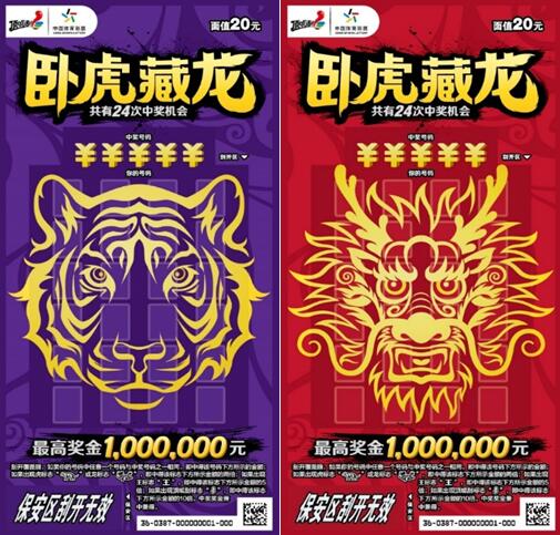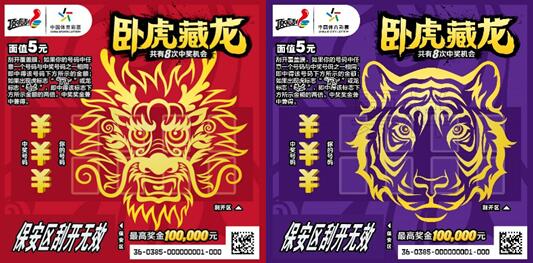 本次上市的“臥虎藏龍”主題即開(kāi)套票,共有5元、10元、20元三種面值。票面設(shè)計(jì)色彩濃郁、霸氣美觀,“虎頭”、“龍頭”標(biāo)識(shí)躍然于票面正中,“眼神”犀利且極富“挑戰(zhàn)”意味,寓意充滿自信,敢于挑戰(zhàn)最高獎(jiǎng)金。