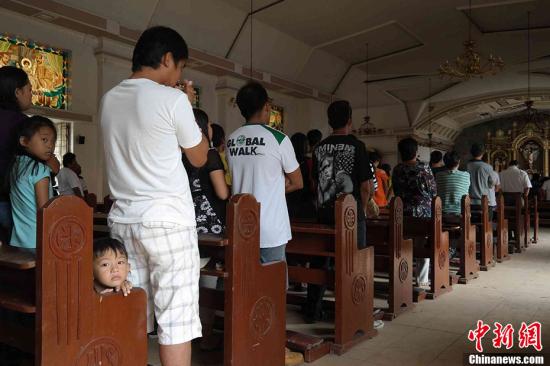11月17日,菲律賓中部港口城市奧爾莫克大批民眾在當?shù)匾蛔烫脜⒓訌浫?,尋求精神慰藉。中新社發(fā) 張明 攝