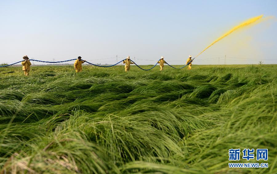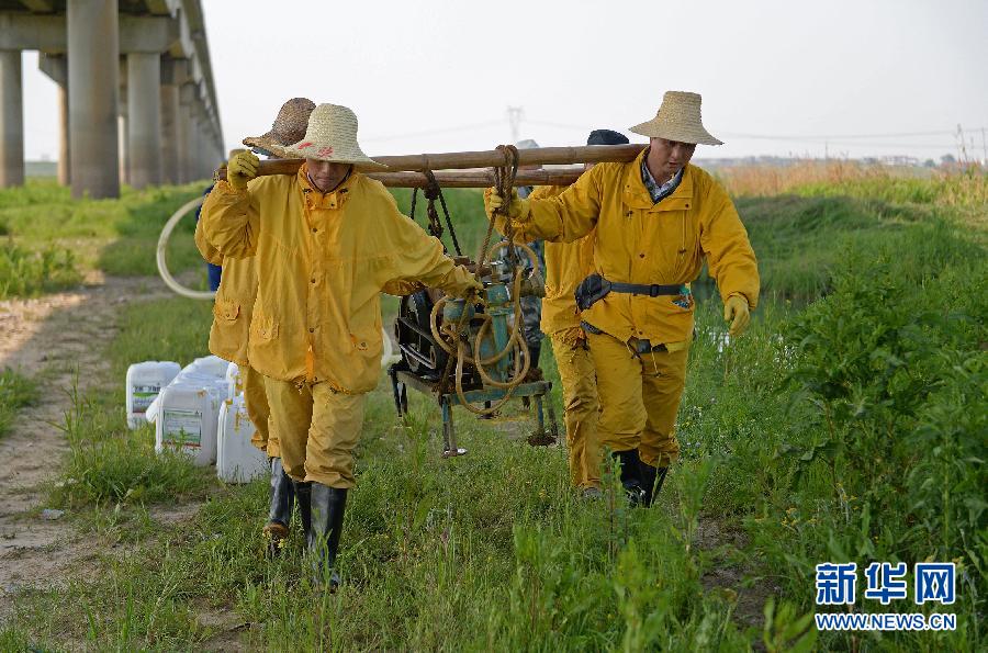 滅螺隊隊員扛著150米的皮管對重點地區(qū)進(jìn)行藥物滅螺(4月14日攝)。