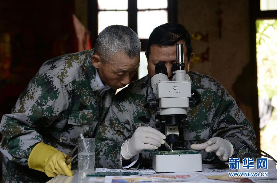 在租住當(dāng)?shù)剞r(nóng)民的房子里,滅螺隊員熊林根(右)用顯微鏡觀察當(dāng)天收集的釘螺樣本(4月14日攝)。 新華社記者 萬象 攝
