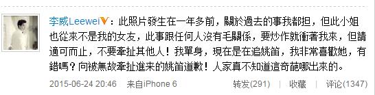 6月24日晚,李威發(fā)布微博回應“照片門”,表示“此照片發(fā)生在一年多前,關于過去的事我都擔,但此小姐也從來不是我的女友,此事跟任何人沒有毛關系,要炒作就沖著我來,但請適可而止,不要牽扯其他人!我單身,現(xiàn)在是在追姚笛,我非常喜歡她,有錯嗎?向被無故牽扯進來的姚笛道歉!人家真不知道這奇葩哪出來的?!?/font>