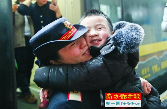 2月10日16時57分,深圳開往烏魯木齊的Z 230次列車??亢怅栒?,由知名導(dǎo)演陳可辛執(zhí)導(dǎo)的短片《三分鐘》原型列車員劉鐘與兒子丁丁在站臺短暫相聚三分鐘。緊緊的相擁后告別在即,劉鐘眼中含淚,她還要上班至15日。不過,讓劉鐘特別開心的是今年她終于可以回家過除夕,這是11年來第一次。 南都記者 馬強(qiáng) 攝