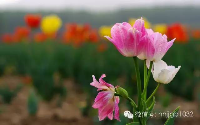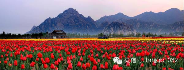 在嵖岈山天磨湖景區(qū)外,有著近300畝約有100多萬株的荷蘭郁金香種植基地,顏色多達(dá)36種之多。
