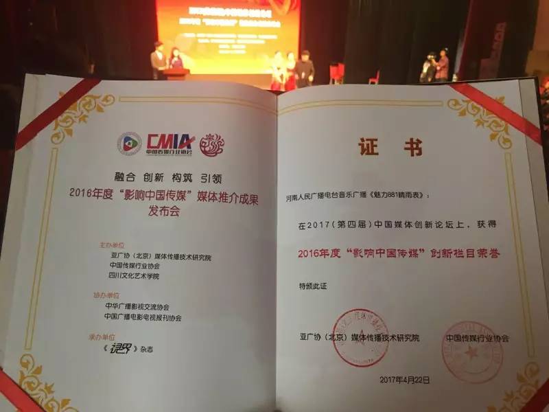 魅力881河南音樂(lè)廣播獲得2016年度”影響中國(guó)傳媒“最具創(chuàng)新力媒體獎(jiǎng),《魅力881晴雨表》獲得2016年度“影響中國(guó)傳媒”創(chuàng)新欄目獎(jiǎng),DJ 陽(yáng)陽(yáng)出席論壇及典禮,與來(lái)自全國(guó)的媒體同仁進(jìn)行交流,分享廣播影視產(chǎn)業(yè)的寶貴經(jīng)驗(yàn)。