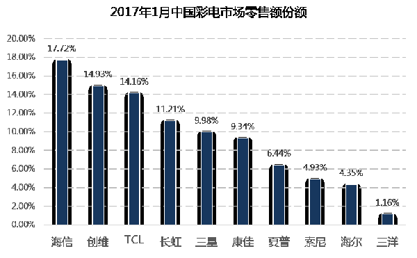 根據(jù)中怡康最新發(fā)布的2017年1月份月報(bào)統(tǒng)計(jì)數(shù)據(jù),海信電視零售量、零售額占有率分別達(dá)到16.7%和17.7%,雙雙高居中國彩電市場銷售量和銷售額占有率的第一位,其中銷售額占有率超出第二名2.79個百分點(diǎn).
