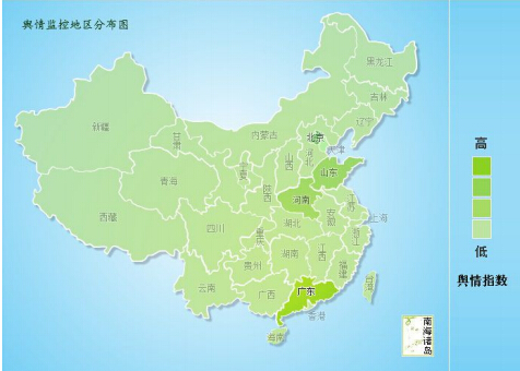 下圖為輿情監(jiān)控地區(qū)分布圖,大象輿情研究院通過對此事件相關報道網站ICP監(jiān)管所屬地區(qū)的挖掘分析,廣東媒體的傳播活躍度最高,這與廣東地區(qū)歷來開風氣之先、敢作敢為的特征相吻合;其次是 北京、山東、河南的媒體。