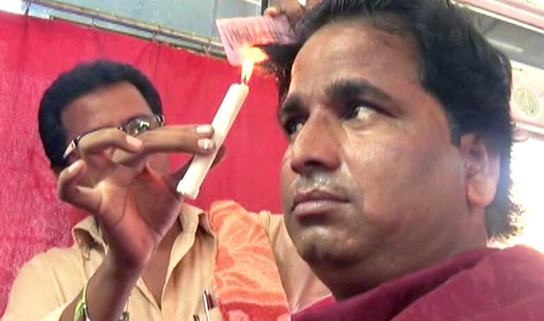 2016年11月1日報道(具體拍攝時間不詳),印度卡納塔克邦古爾伯加,28歲的DasharathKumar展示自己的獨門絕技——用蠟燭理發(fā)。