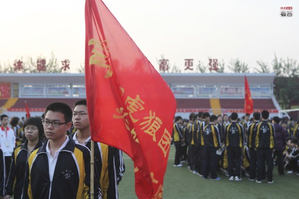 這樣的誓師大會(huì)每年都會(huì)舉行,而類(lèi)似于誓師的各種勵(lì)志行動(dòng)在這里都相當(dāng)常見(jiàn)。圖為2012年5月1日,衡水二中操場(chǎng)上,一名學(xué)生舉著寫(xiě)有“虎狼團(tuán)”字樣的旗幟參加跑操。