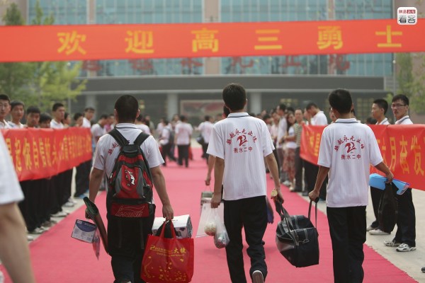 圖為2013年5月24日,衡水二中高三學(xué)生經(jīng)過(guò)短暫的休息返校,這次返校后他們下一次休息將是高考結(jié)束。歸校時(shí),他們被譽(yù)為“勇士”,所有高三班主任則站在門(mén)口兩側(cè)迎接學(xué)生歸來(lái)。
