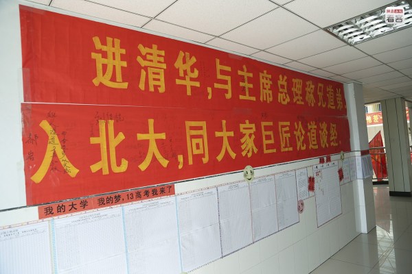 每當(dāng)空閑的時(shí)候,她便望向路對(duì)面校門(mén)口的展板上那張考上清華、北大學(xué)生與校長(zhǎng)的大合影。她希望明年在這里也能看到女兒的身影。