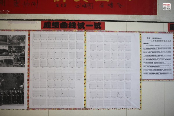 圖為2013年5月10日,學(xué)校走廊上貼著的“成績(jī)曲線(xiàn)”,將每個(gè)學(xué)生歷次考試成績(jī)以曲線(xiàn)的方式展現(xiàn)。而這樣類(lèi)似的成績(jī)表、成績(jī)單布滿(mǎn)了走廊的每一面墻。