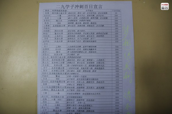 圖為2009年6月1日,墻上貼著學(xué)生們?cè)跊_刺百日時(shí)寫(xiě)下的誓言,每個(gè)人的目標(biāo)不同,但都會(huì)盡量具體到一個(gè)學(xué)校甚至增加多少分?jǐn)?shù),也都會(huì)留下一個(gè)“宣言”激勵(lì)自己。