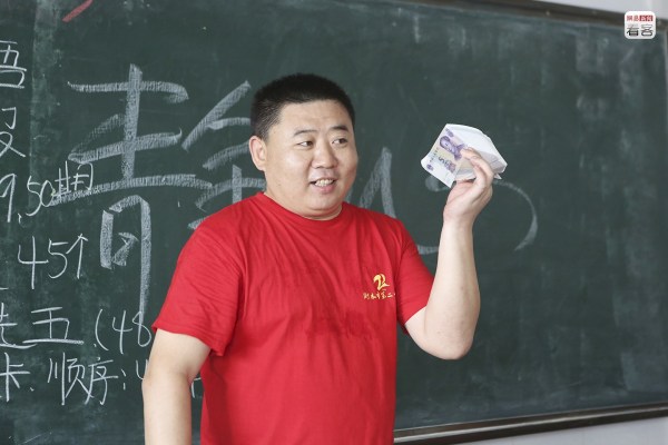 學(xué)校的另一項(xiàng)解壓措施是發(fā)放“回頭錢(qián)”,向每名學(xué)生發(fā)兩張五元紙幣,寓意“五谷豐登”、“十全十美”。圖為2012年6月3日,一位老師拿著一沓新紙幣準(zhǔn)備發(fā)給學(xué)生。