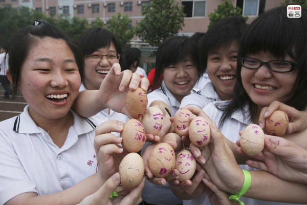 吃“幸運(yùn)蛋”、過(guò)“成功門(mén)”也是學(xué)校每到高考前夕都會(huì)準(zhǔn)備的活動(dòng)。圖為2009年6月7日,學(xué)生們拿著畫(huà)著笑臉的雞蛋。