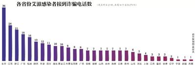 根據(jù)白樺的統(tǒng)計,截至昨日晚上,北京、江蘇、浙江三地接到詐騙電話的感染者人數(shù)最多,分別為36個、24個和21個。北京的兩位感染者和甘肅的一位感染者分別被詐騙3000元、2300元和700元。