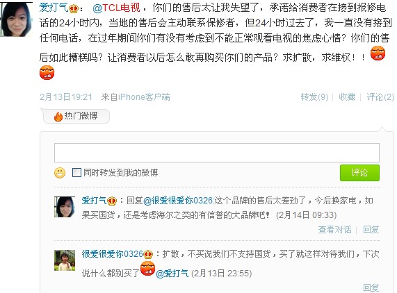 2月13日網(wǎng)友愛(ài)打氣首先曝出TCL售后的問(wèn)題,其表示,TCL電視的售后讓人失望,承諾給消費(fèi)者在接到報(bào)修電話(huà)的24小時(shí)內(nèi),當(dāng)?shù)氐氖酆髸?huì)主動(dòng)聯(lián)系保修者,但一直都沒(méi)有兌現(xiàn)。