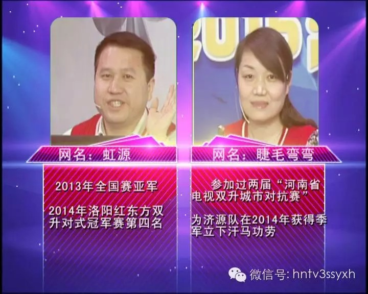 “睫毛彎彎”代表濟(jì)源參加兩屆城市對抗賽,為濟(jì)源隊(duì)在2014年獲得季軍立下汗馬功勞,“虹源”是濟(jì)源隊(duì)隊(duì)長,帶領(lǐng)濟(jì)源隊(duì)多次獲得優(yōu)異成績,曾獲得2013年全國賽亞軍,2014年洛陽紅東方雙升對式冠軍賽第四名。