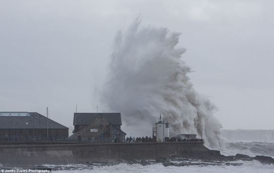 英國數十民眾聚集海邊大膽觀看驚濤巨浪的場面