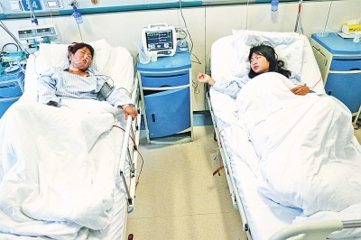 昨天下午4點多,當(dāng)記者在鄭大一附院肝移植病區(qū)見到張文亞和李愛云時,兩人正躺在床上輸液。