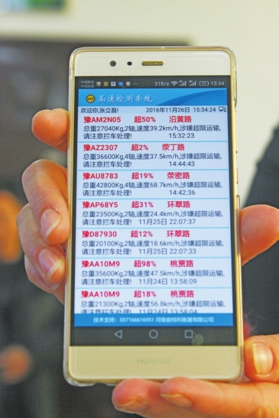 超載信息通過監(jiān)控裝置實時傳輸?shù)街登诮痪氖謾C中。