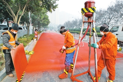 “機(jī)動(dòng)車道6米寬,鋪設(shè)‘綠道’的自行車道也為6米寬??磻T了灰黑色的路面,在看到色彩明銳的‘綠道’后肯定覺得眼前一亮?!G道’只是叫法,并不是說(shuō)道路外觀一定是綠色的,在景觀設(shè)計(jì)中,‘綠道’往往有著更深更廣的內(nèi)涵。”工程負(fù)責(zé)人呂先生告訴記者,彩色瀝青厚度僅為1到2毫米,壽命在5年以上,具有警示、防滑、降噪、美觀等特點(diǎn)。“我國(guó)‘綠道’通常以警示色紅色為主打,主要作用是打造人車分離模式,供騎車者和步行者休閑使用。”