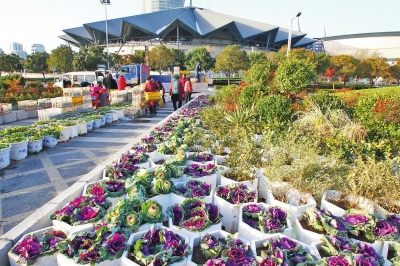 “嘿,快看,真美!感覺好像瞬間穿越到了絢麗多彩的春季!”昨日中午,在鄭東新區(qū)CBD商務(wù)內(nèi)環(huán),幾名市民指著花壇內(nèi)一大片黃、紅、紫三色相間的鮮花說(shuō)。在這里,記者看到一撥撥工作人員正忙著將一盆盆鮮花擺放到預(yù)先設(shè)置好的花架上。姿態(tài)秀逸、枝葉扶蘇,綴滿鮮艷奪目紅果的南天竹十分吸睛;各種色彩亮麗的花朵,則為冬日的鄭州增添了一抹迷人的色彩;株形如牡丹,葉片形態(tài)美觀多變,觀賞性不輸鮮花的甘藍(lán)更是隨處可見。
